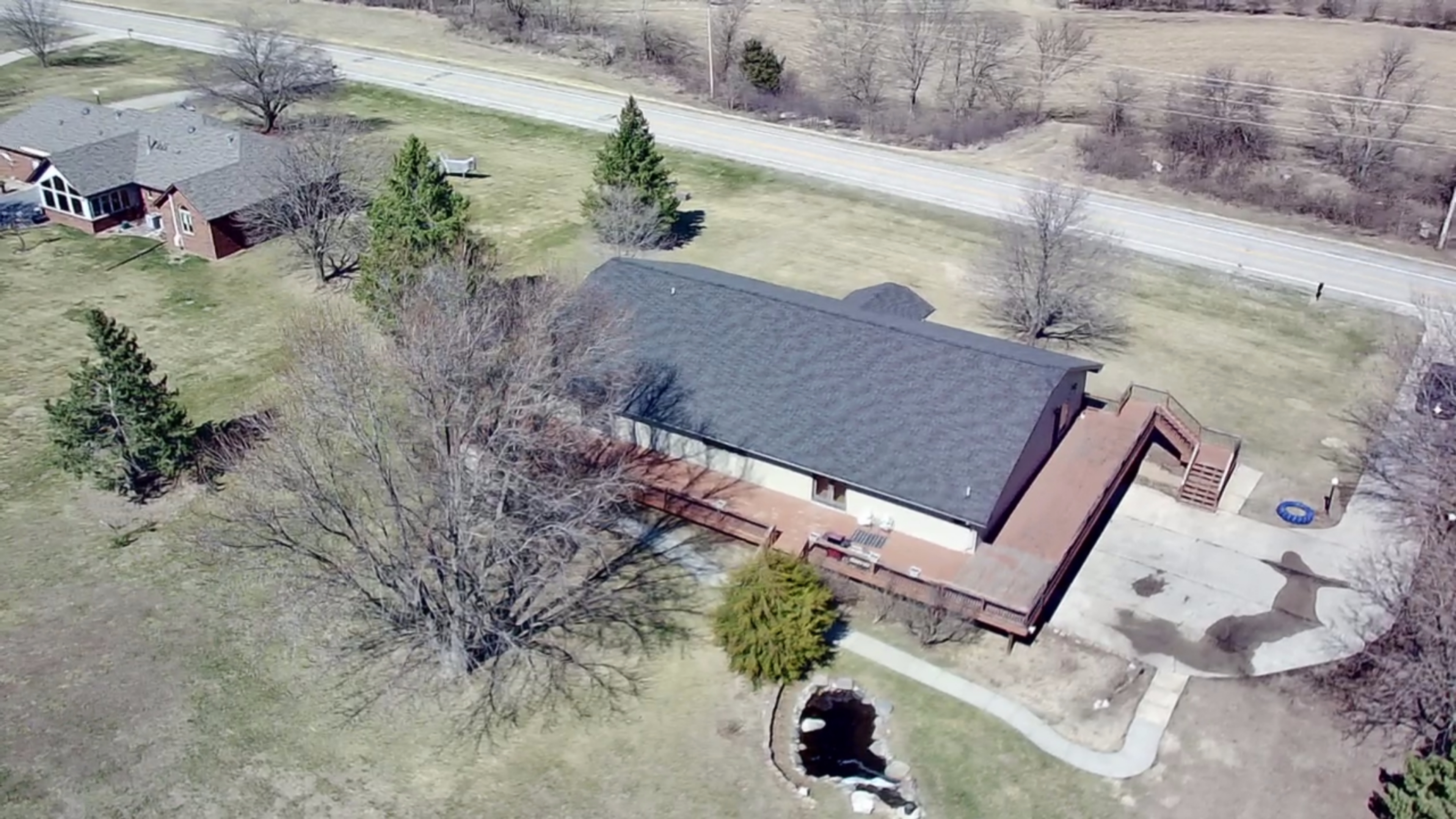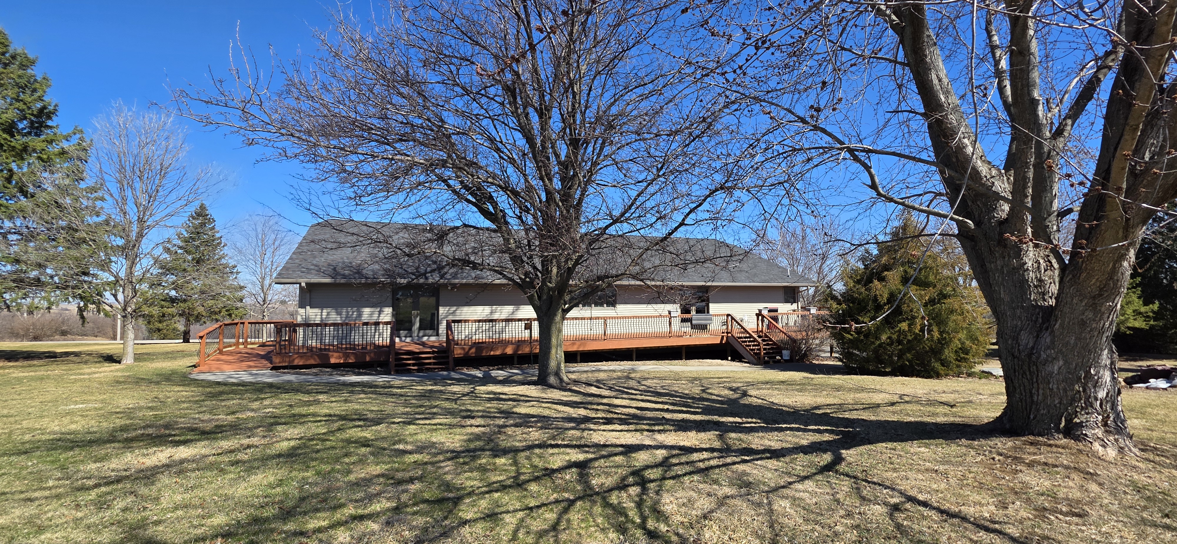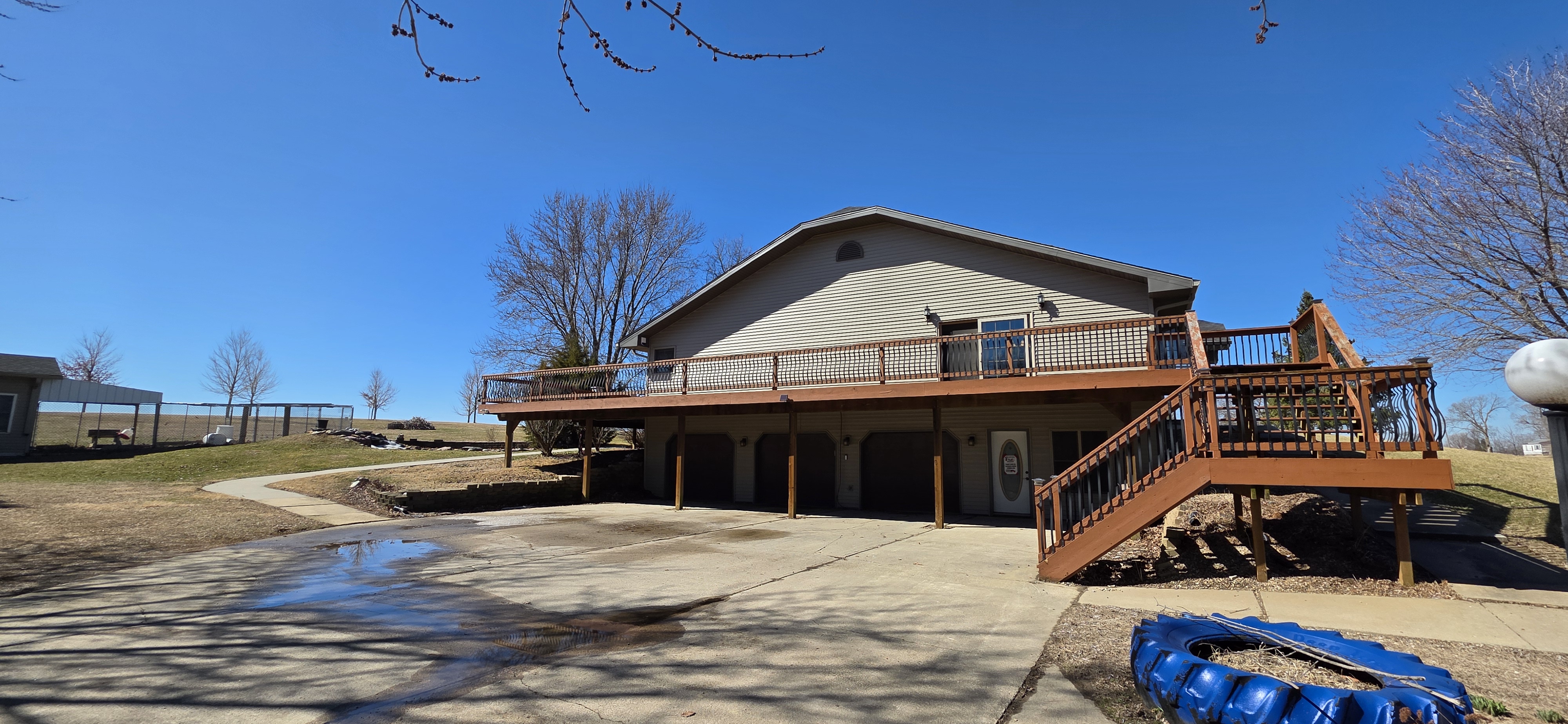 Experience the perfect blend of scale, flexibility, and serenity in this sprawling 5,338 sq ft raised ranch set on 1.06 acres of picturesque countryside. From the moment you arrive, the home makes a lasting impression with expansive views and a prime hard-surface location. Designed with versatility in mind, this home is ideal for large families, multi-generational living, or those running a home-based business. The heart of the home features an oversized eat-in kitchen with a massive center island, custom pantry with pullouts, double ovens, and instant hot water. It flows effortlessly through an atrium door to a wrap-around deck, perfect for entertaining or relaxing while taking in the views—with opportunity to expand the deck even further. The vaulted great room showcases rustic wood beams, a cozy fireplace, and direct deck access. The primary suite offers a private retreat with full bath, spacious walk-in closet, and its own access to the deck. Three additional large bedrooms and four total bathrooms provide ample space for everyone. The lower level adds incredible flexibility with a large family room, fireplace, additional bath, and multiple bonus rooms ideal for bedrooms, office space, or guest quarters. Car enthusiasts, hobbyists, or business owners will appreciate the 6-car tuck-under garage with shop space, private office areas, and a separate furnace. Additional features include accessibility with ramp and chair lift, a waterproofed basement for peace of mind, and major updates including roof, siding, and windows (2023) and septic system (2019). This is a rare opportunity to own a property that combines massive square footage, functionality, and long-term livability—all in a beautiful setting.