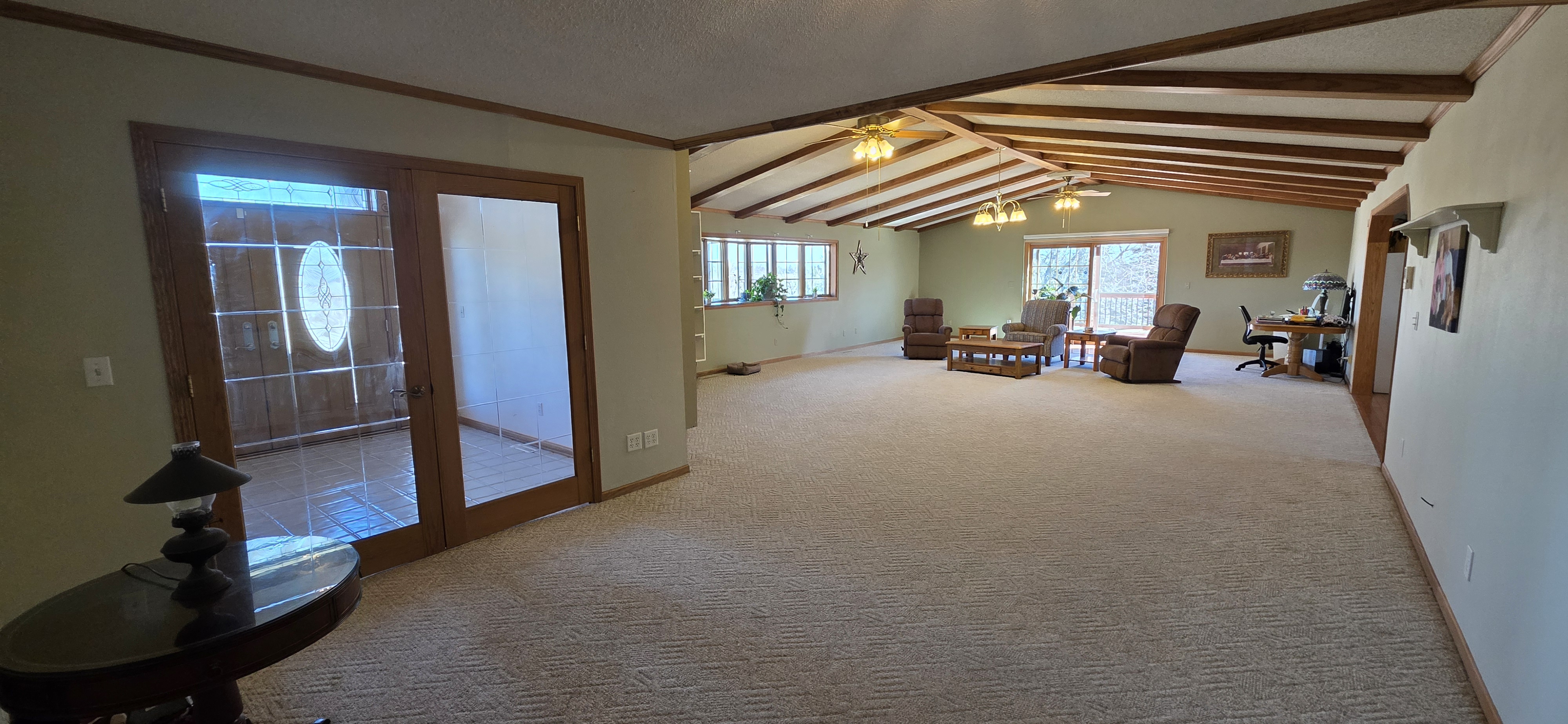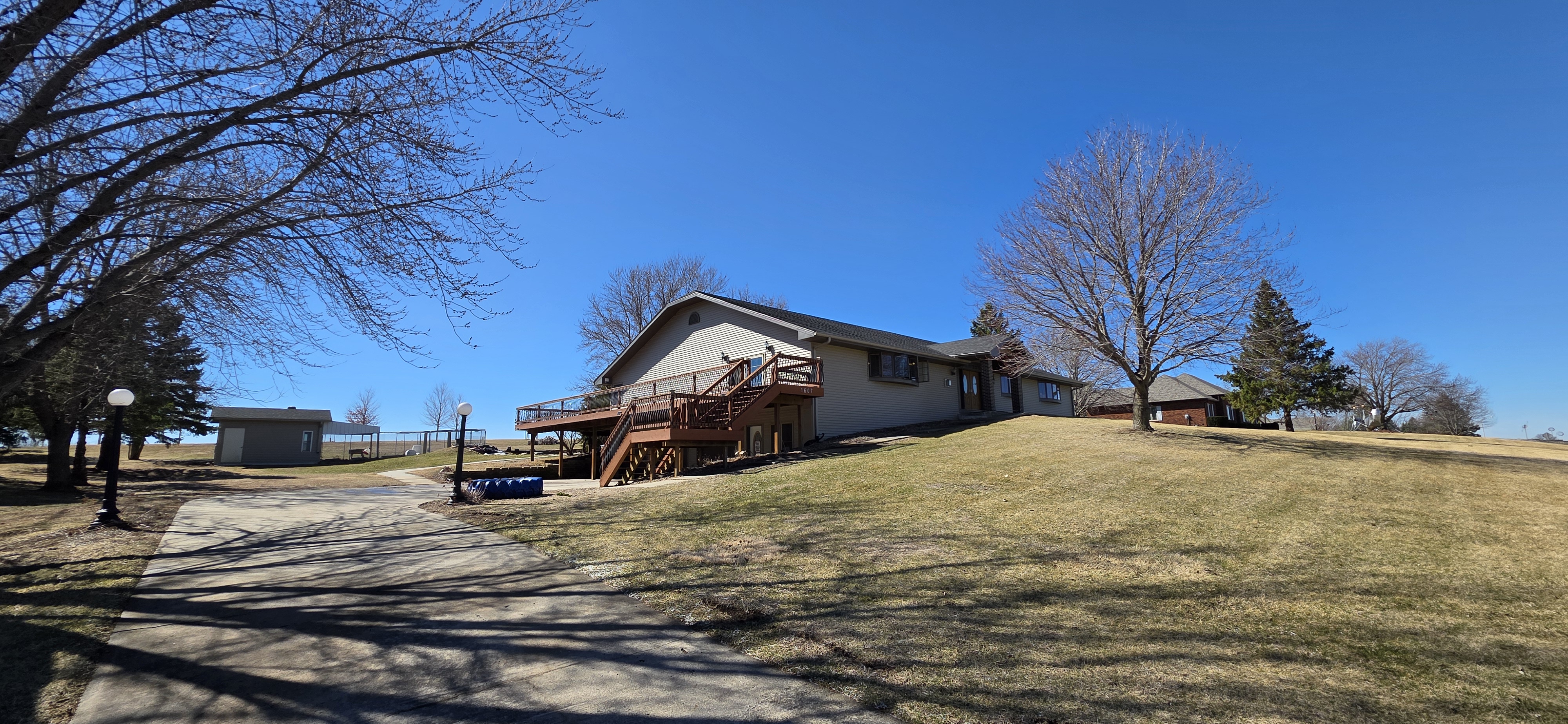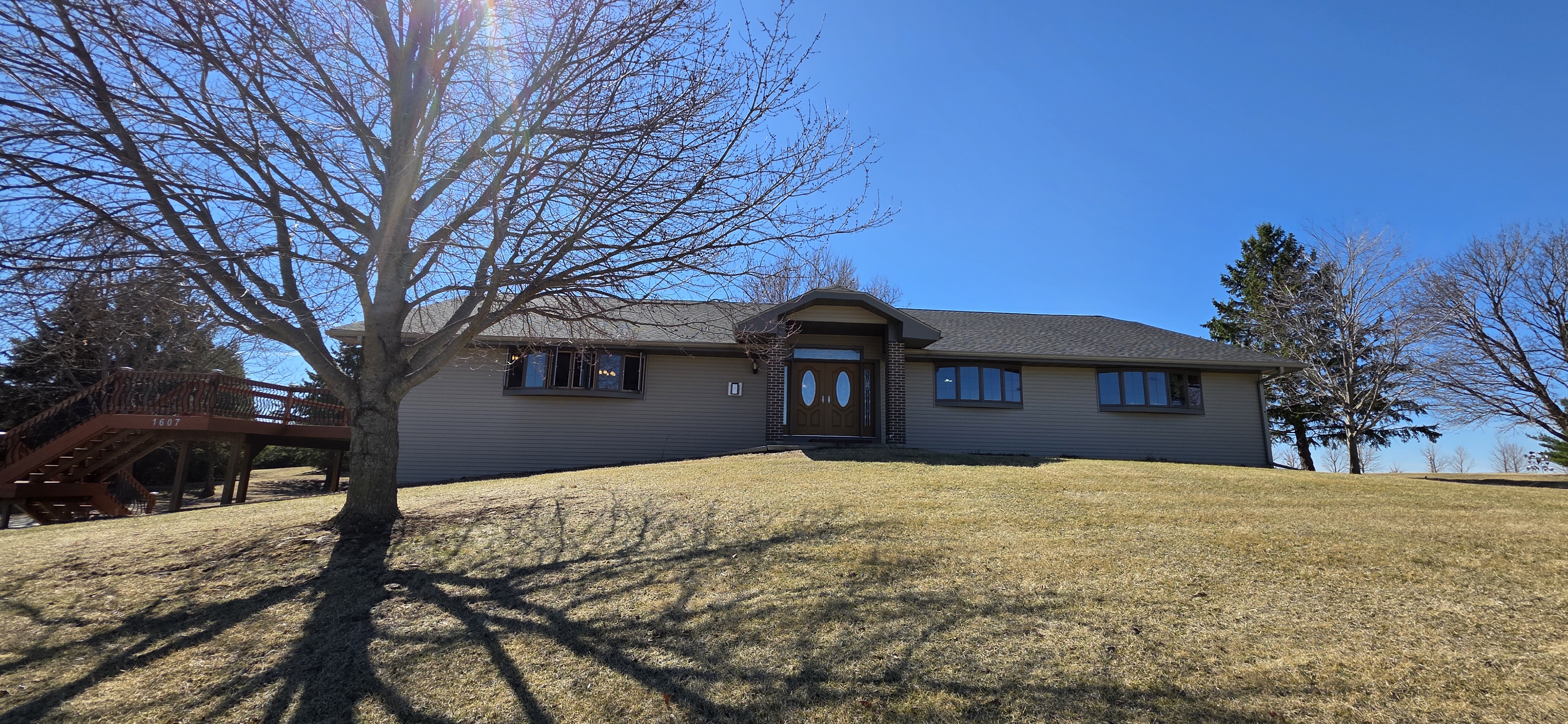 Experience the perfect blend of scale, flexibility, and serenity in this sprawling 5,338 sq ft raised ranch set on 1.06 acres of picturesque countryside. From the moment you arrive, the home makes a lasting impression with expansive views and a prime hard-surface location. Designed with versatility in mind, this home is ideal for large families, multi-generational living, or those running a home-based business. The heart of the home features an oversized eat-in kitchen with a massive center island, custom pantry with pullouts, double ovens, and instant hot water. It flows effortlessly through an atrium door to a wrap-around deck, perfect for entertaining or relaxing while taking in the views—with opportunity to expand the deck even further. The vaulted great room showcases rustic wood beams, a cozy fireplace, and direct deck access. The primary suite offers a private retreat with full bath, spacious walk-in closet, and its own access to the deck. Three additional large bedrooms and four total bathrooms provide ample space for everyone. The lower level adds incredible flexibility with a large family room, fireplace, additional bath, and multiple bonus rooms ideal for bedrooms, office space, or guest quarters. Car enthusiasts, hobbyists, or business owners will appreciate the 6-car tuck-under garage with shop space, private office areas, and a separate furnace. Additional features include accessibility with ramp and chair lift, a waterproofed basement for peace of mind, and major updates including roof, siding, and windows (2023) and septic system (2019). This is a rare opportunity to own a property that combines massive square footage, functionality, and long-term livability—all in a beautiful setting.